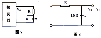 (3)单LED电平指示电路。在放大器、振荡器或脉冲数字电路的输出端,可用LED表示输出信号是否正常,如图7所示。R为限流电阻。只有当输出电压大于LED的阈值电压时,LED才可能发光。