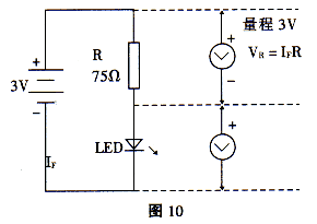 (2)外接电源测量。用3V稳压源或两节串联的干电池及万用表(指针式或数字式皆可)可以较准确测量发光二极管的光、电特性。为此可按图10所示连接电路即可。如果测得VF在1.4~3V之间,且发光亮度正常,可以说明发光正常。如果测得VF=0或VF≈3V,且不发光,说明发光管已坏。