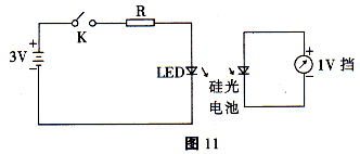 由于红外发光二极管,它发射1~3μm的红外光,人眼看不到。通常单只红外发光二极管发射功率只有数mW,不同型号的红外LED发光强度角分布也不相同。红外LED的正向压降一般为1.3~2.5V。正是由于其发射的红外光人眼看不见,所以利用上述可见光LED的检测法只能判定其PN结正、反向电学特性是否正常,而无法判定其发光情况正常否。为此,最好准备一只光敏器件(如2CR、2DR型硅光电池)作接收器。用万用表测光电池两端电压的变化情况。来判断红外LED加上适当正向电流后是否发射红外光。其测量电路如图11所示.