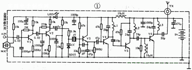 所有部件型号参数见图1;1.微型色码高频电容为首选对象,并采用卧式安装以减小引线电感造成的影响;2.JT选用标称频率为49.860MHz的泛音式晶体,对于不同的输出功率要求,可根据实际情况选择用其它频点;3.L1、L2、L3为倍频及高频放大器谐振电感,建议选用Φ0.8mm镀银线在4.0mm骨架上绕制,匝数分别为5T、4T、5T;Vl、V2决定着高频级的噪声系数及增益,可选用β值在300左右的低噪管,如C945、C9014等;V3-V5要求β100-120间,fT>500MHz,C1975、C9018等均可择用。V6要求β=100,fT>800MHz,Pc>500mW的高频中功率管,如C2581、D40、C2053,对输出功率要求不高时,还可将其省去。TX可选用拉杆天线或1.5m软导线,当工作频率为100MHz时75cm长度为理想值。